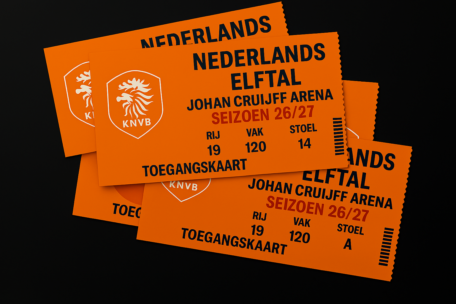 4 Kaarten voor een Nederlands Elftal-wedstrijd in de strijd naar de kwalificatie van het EK in 2028 (Seizoen 2026/2027) Beleef topvoetbal in de Johan Cruijff ArenA! Met dit kavel ontvangt u vier tickets voor een Nederlands Elftal -wedstrijd naar keuze in het seizoen 2026/2027. Geniet van het spektakel vanaf de 1e ring, korte zijde, en ervaar de unieke sfeer van een thuiswedstrijd van de Oranje Helden. Een must voor elke voetbalfan ? bied mee en juich voor Oranje!